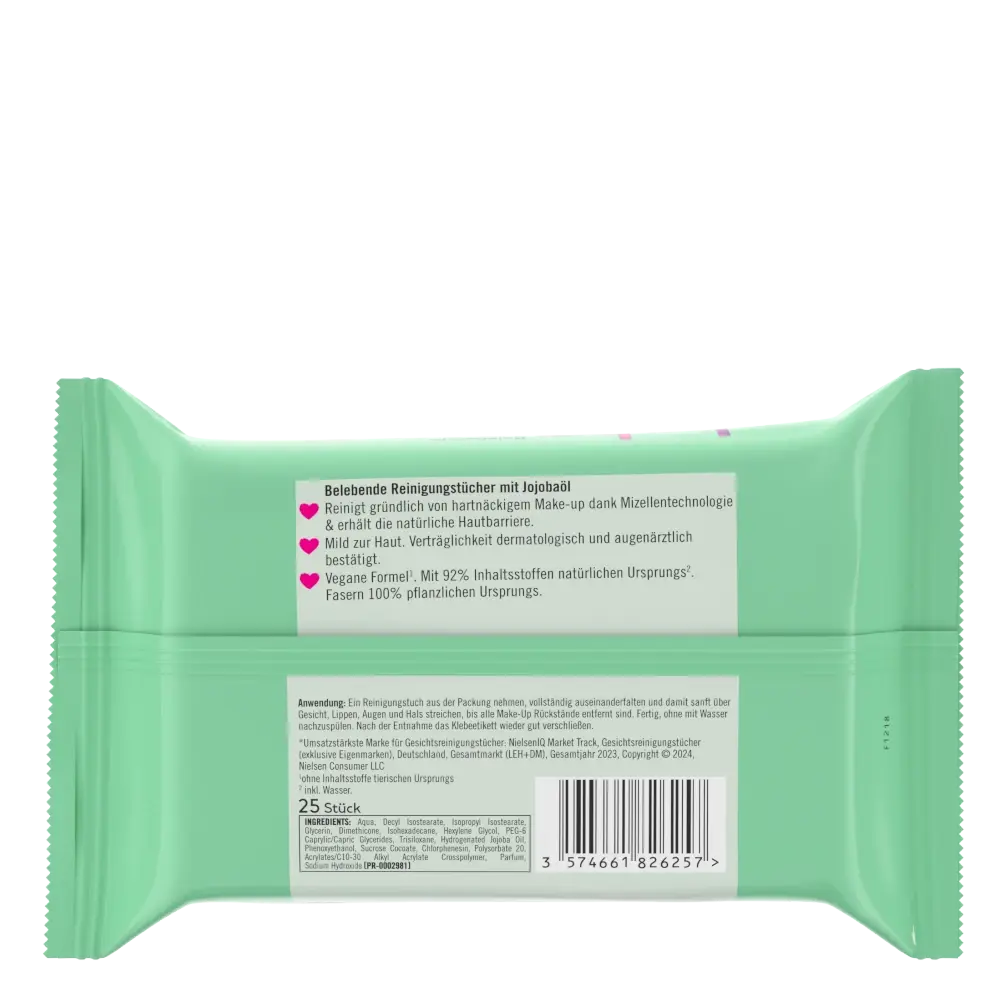 Ein Reinigungstuch aus der Packung nehmen, vollständig auseinanderfalten und damit sanft über Gesicht, Lippen, Augen und Hals streichen, bis alle Make-Up Rückstände entfernt sind. Fertig, ohne mit Wasser nachzuspülen. Nach der Entnahme das Klebeetikett wieder gut verschließen.