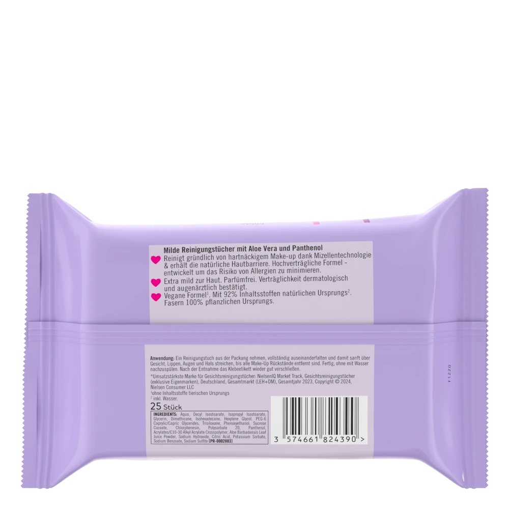 Ein Reinigungstuch aus der Packung nehmen, vollständig auseinanderfalten und damit sanft über Gesicht, Lippen, Augen und Hals streichen, bis alle Make-Up Rückstände entfernt sind. Fertig, ohne mit Wasser nachzuspülen. Nach der Entnahme das Klebeetikett wieder gut verschließen.